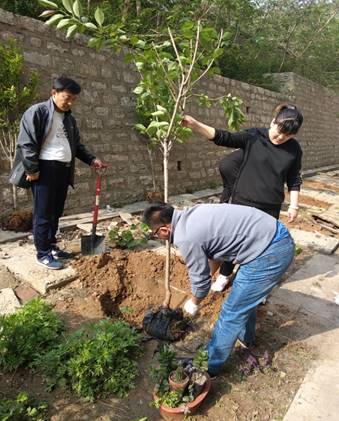 在黨支部書記的帶領(lǐng)下,黨、團員青年明確分工、齊心協(xié)力、鼓足干勁、揮鍬培土、栽下新苗。每道工序都做得認真細致,一絲不茍。植樹現(xiàn)場,處處是忙碌的身影,汗水伴隨著歡笑聲,構(gòu)成一幅熱火朝天的勞動景象。經(jīng)過2個多小時的辛勤勞動,16株海棠、櫻花和薔薇樹苗昂然挺立,在匡山大院落地生根。